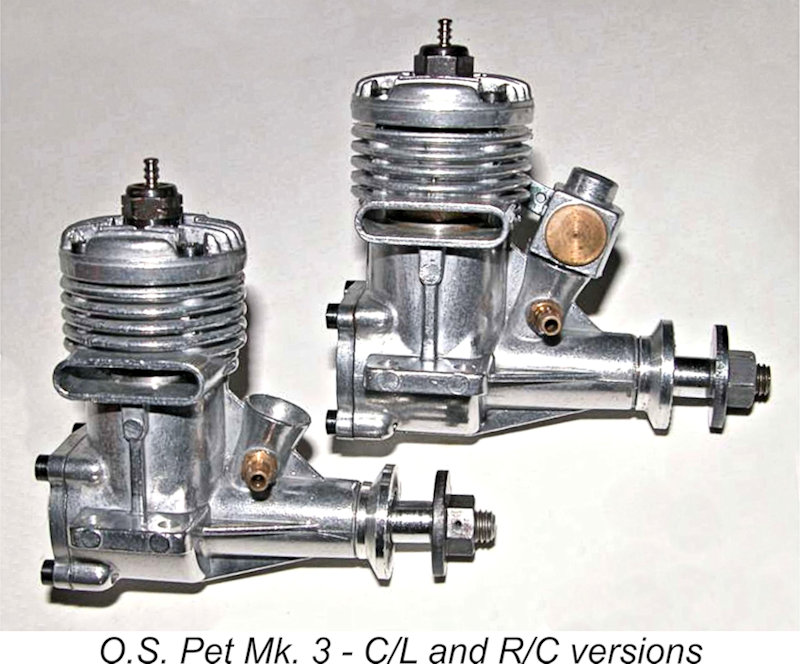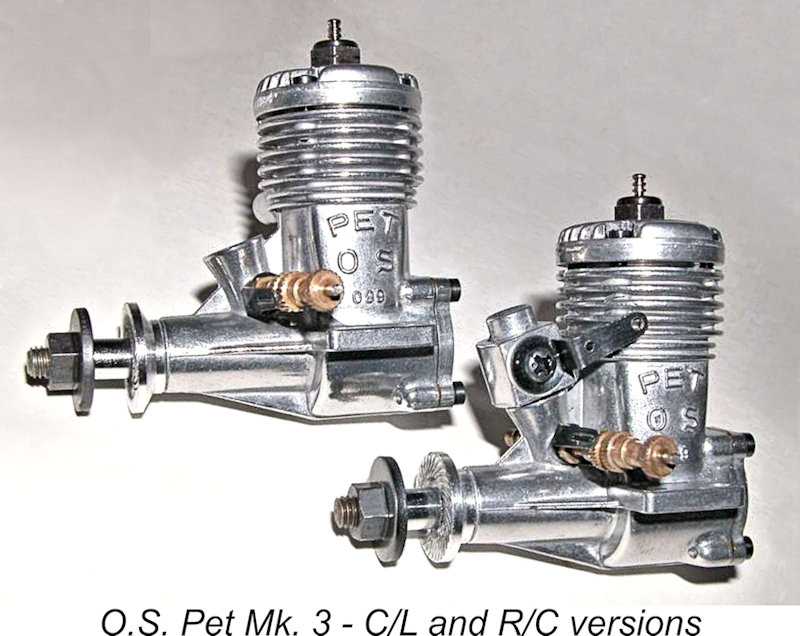 By the late 1950’s, O.S. was on a roll. They now had new expanded production facilities well equipped with modern machinery. The members of their excellent MAX range of glow-plug motors were in high demand throughout their world-wide The O.S. Pet 09 which replaced the earlier New 099 in 1957 benefited from O.S. MAX engine experience and know-how, which offered the prospect of providing improved performance that would be competitive in foreign markets. Low cost and easy operation by novices were also goals that were very much in mind. The Pet’s design took advantage of American production techniques as applied to their mass-produced ½A engines, with the clear objective of minimising production costs. This resulted in a remarkably low $4.95 price tag in the USA at a time when Herkimer was dropping the price of their OK Cub 049A to $3.95 to maintain market volume dominance. The Pet was produced in a wider range of distinct variants than many people realize. We'll briefly summarize those variants next. The O.S. Pet Variants