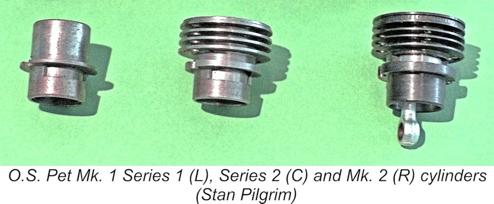 O.S. Pet ProblemsAs mentioned at the outset, the Mk. 1 and Mk. 2 versions of the O.S. Pet suffered to varying degrees from a number of nagging problems which led to some users christening the engine as the “O.S. Pest”! Prominent among these issues were leaking or blown gaskets. The Mk. 1 and Mk. 2 Pet’s central design element is the cylinder mounting flange, with exhaust port above and transfer port below. The cylinder is a loose fit in the crankcase for easier manufacture. The piston is machined with a baffle notch facing the transfer port to secure the desired port duration with the very low transfer port location. In the original Mk. 1 Series 1 Pet, the slip-fit alloy cylinder jacket was clamped against the head and cylinder flange gaskets with only two screws. These gaskets were relatively thick conformable asbestos/composite types. However, the use of only two screws was ill calculated to ensure uniform sealing pressure around the full circumference of the gaskets. Leaks could readily develop, as could head gasket blow-outs.